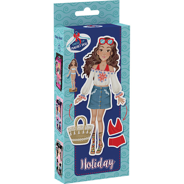 A szett egy öltöztetős figurát, 3 ív mágneses ruhadarabot, lábbelit és kiegészítőt, valamint egy fa alapot tartalmaz.